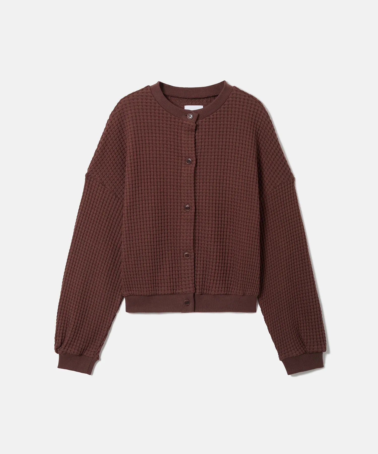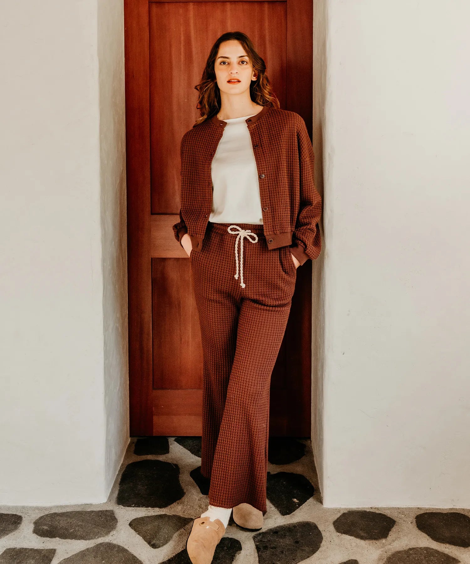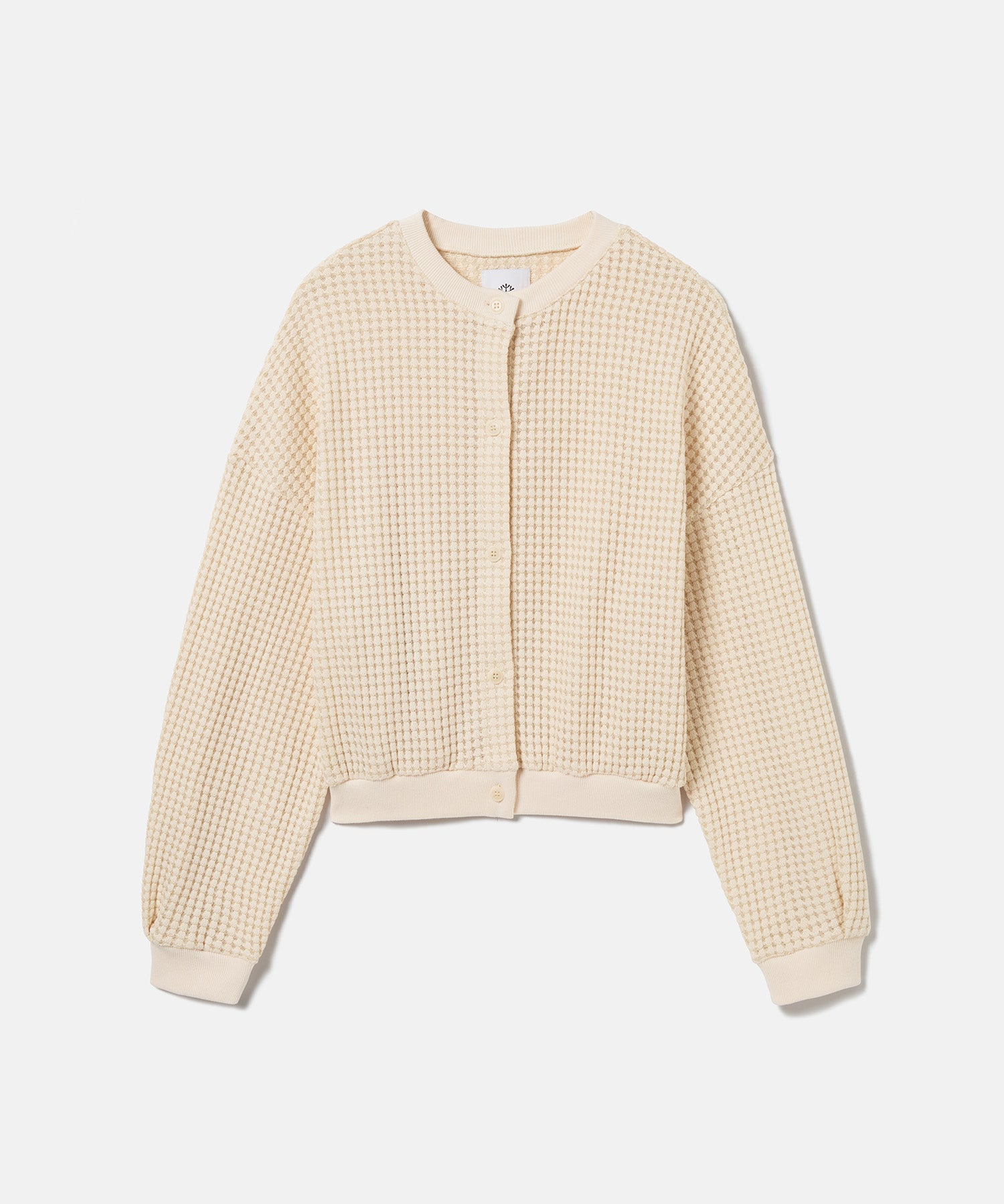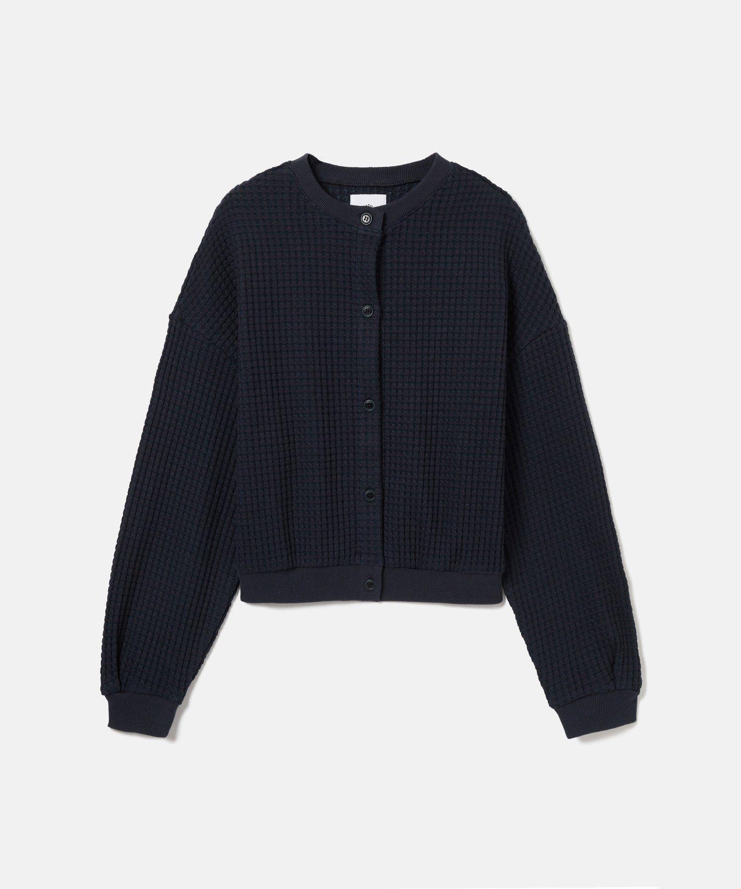 - 国内でも希少な編み機を用い、職人と共同開発したオリジナルワッフル素材を使用。コットンとリサイクルポリエステルを組み合わせ、立体感ある表情と環境配慮を両立。