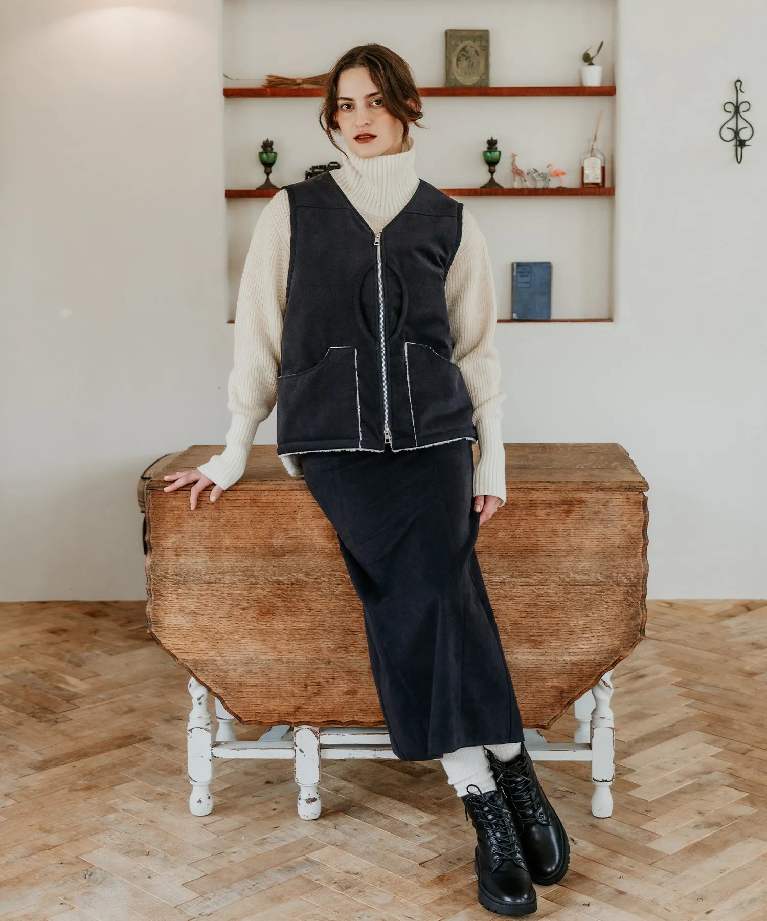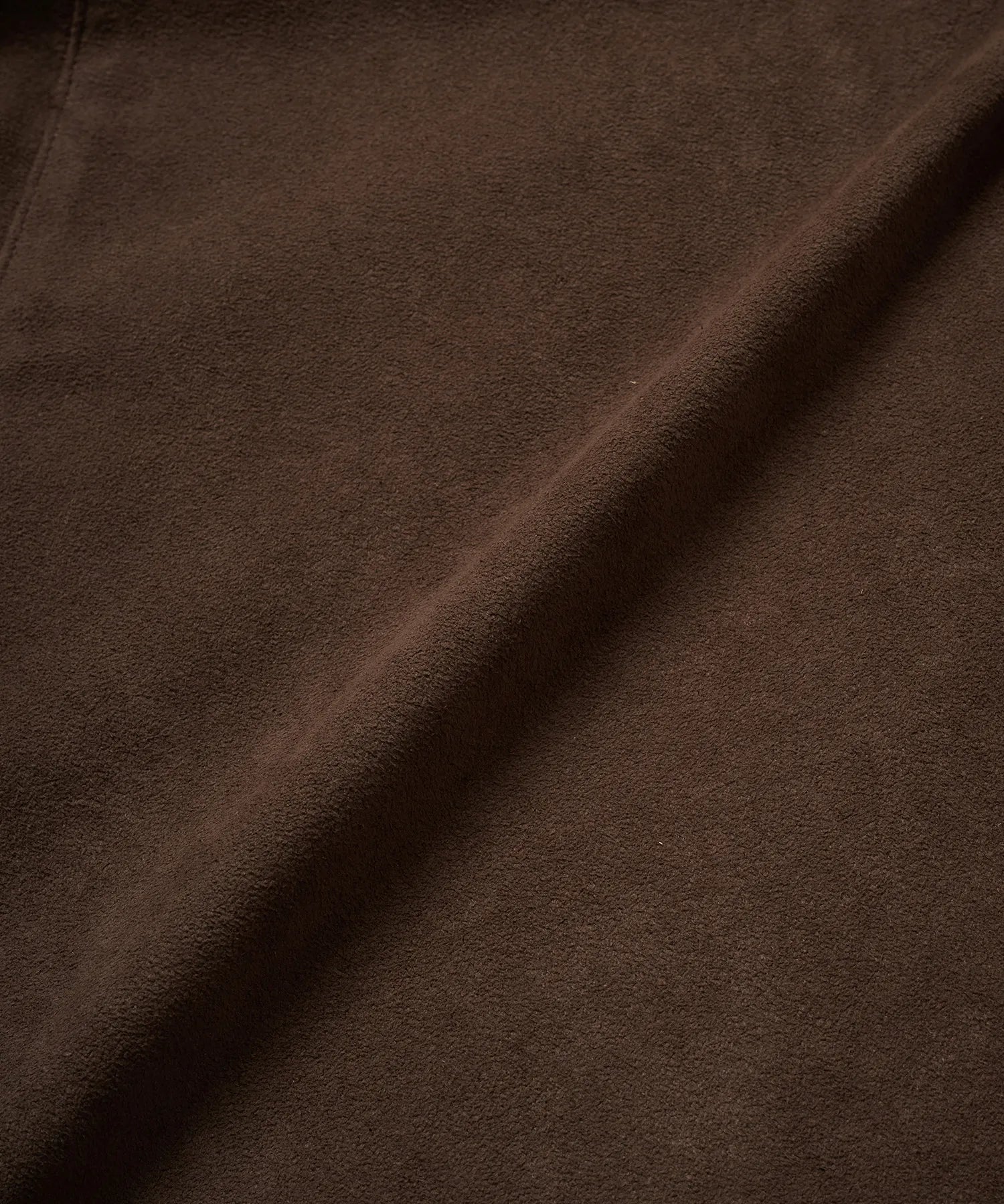 - 廃棄予定のペットボトルを再利用したリサイクルポリエステル糸を使用した、サステナブルな人工皮革スエード素材。シルクの約1/10という極細糸により、なめらかで上質な肌触りと高級感を実現。