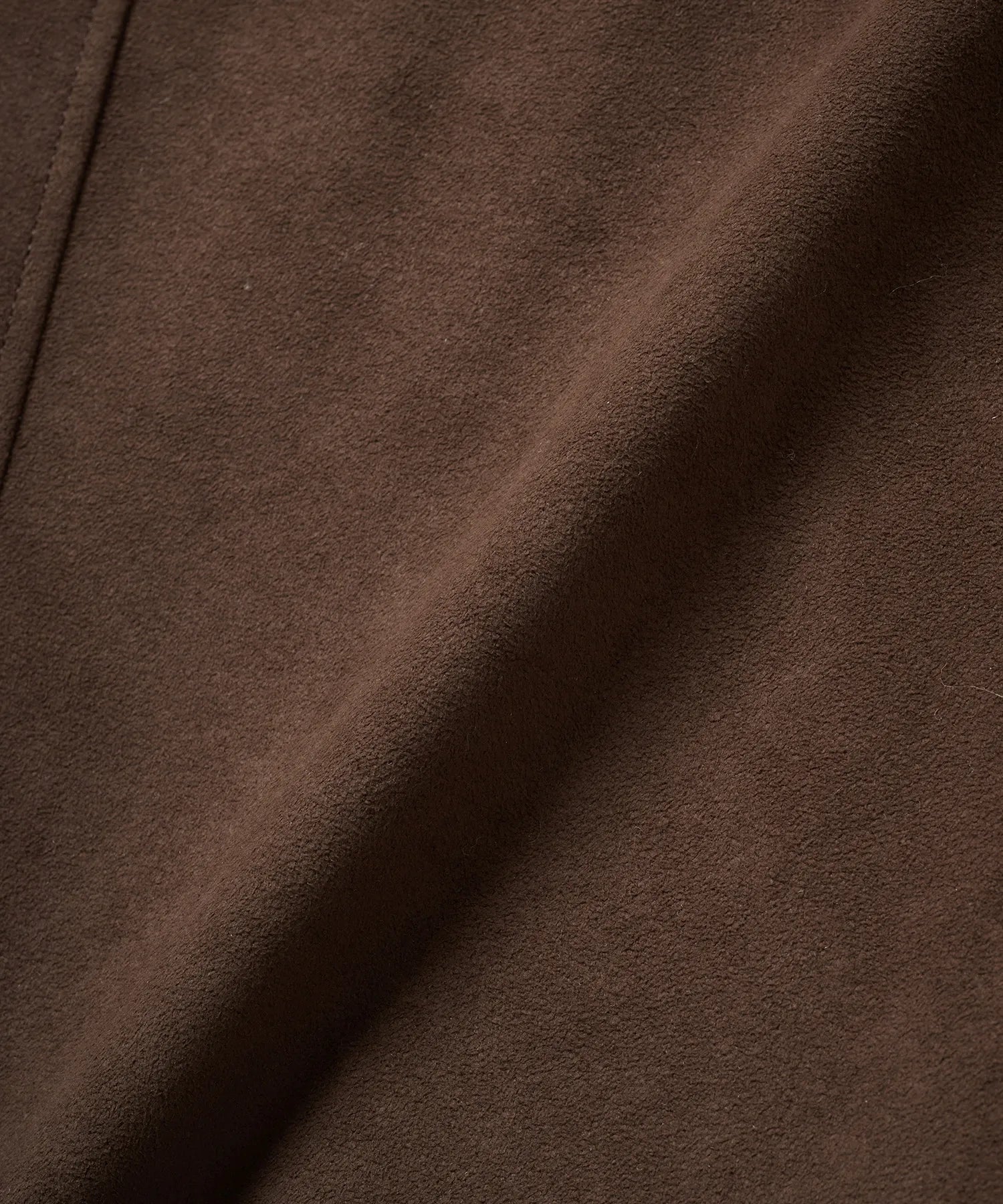 - 廃棄予定のペットボトルを再利用したリサイクルポリエステル糸を使用した、サステナブルな人工皮革スエード素材。シルクの約1/10という極細糸により、なめらかで上質な肌触りと高級感を実現。