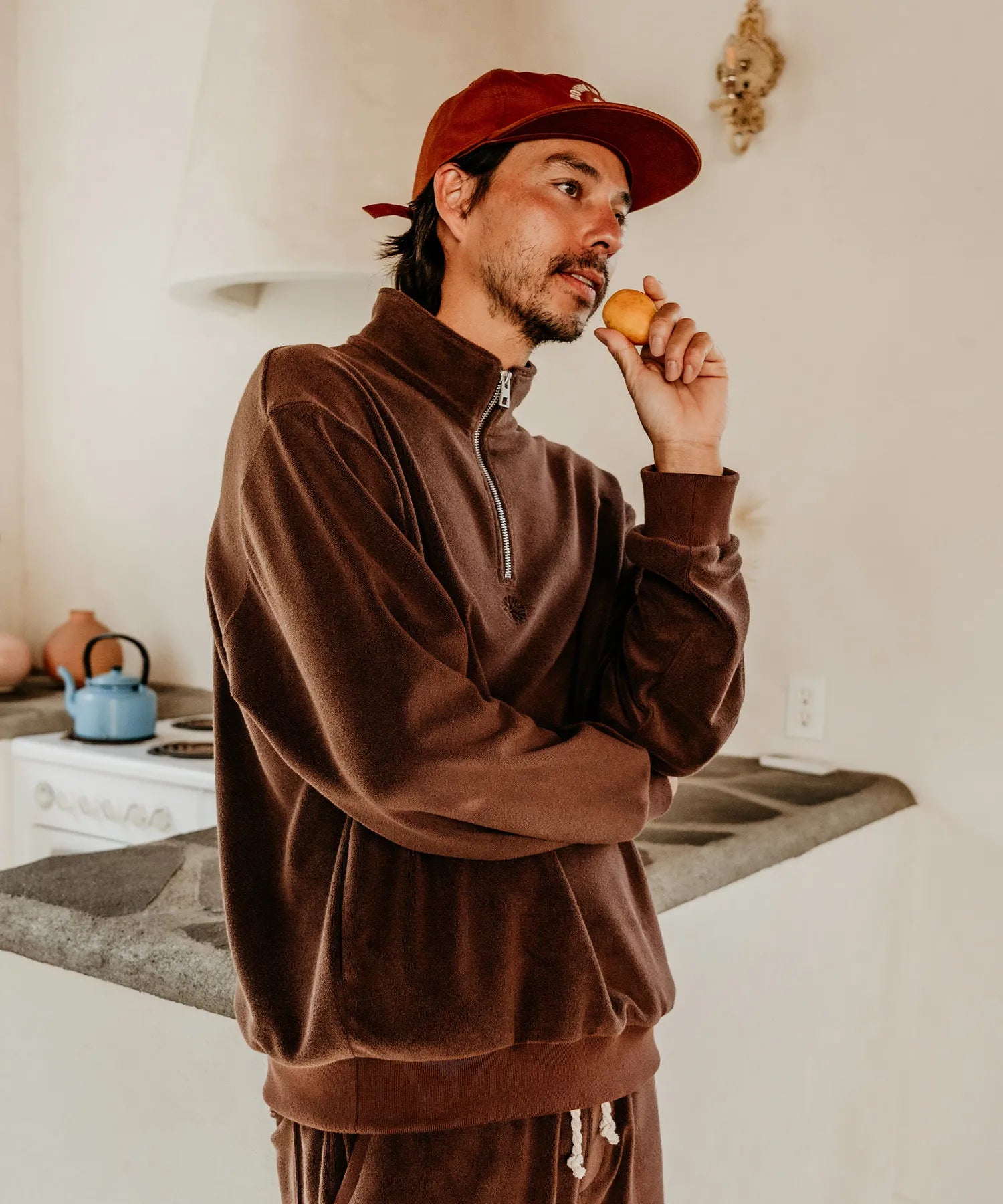 - Un jersey de media cremallera hecha de material de pila de sándwich suave y esponjoso.